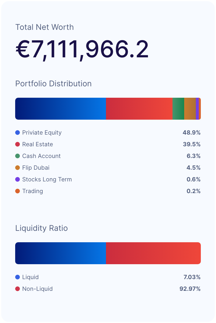 Everything! Real estate, stocks, ETFs, crypto, cash, savings, business assets and liabilities. If it makes up your financial life, it belongs in ARYA. One unified view of your total net worth, regardless of where your assets are held.