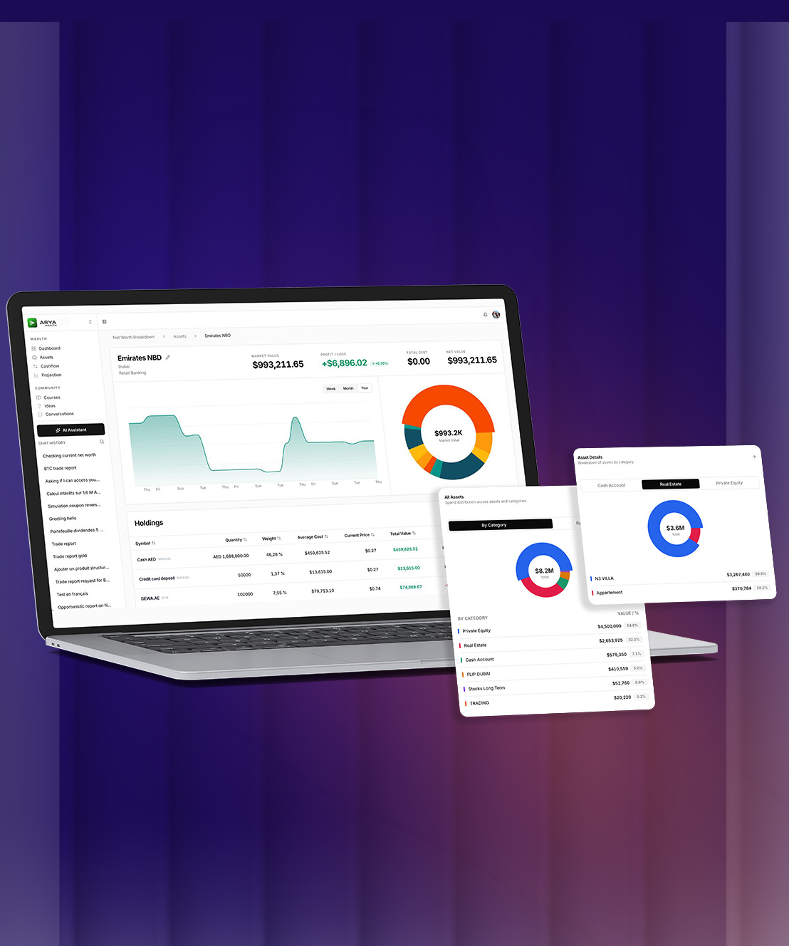 ARYA AI reads your complete financial picture. Every asset, every exposure, your full cashflow. It spots the imbalances you don't see: too much locked in illiquid assets, over-exposed to one asset class after a bull run, capital sitting idle. It tells you what's off and where to reallocate, before it becomes a problem.