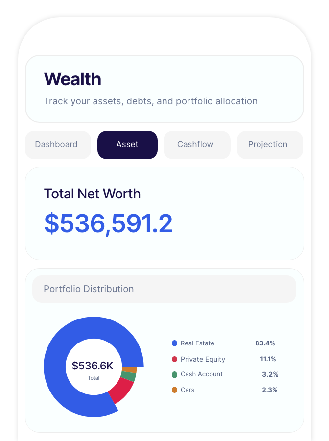 Yes. No credit card, no trial, no hidden fees. Full access to asset tracking, cashflow visibility, net worth overview and financial projections from day one. Free forever.